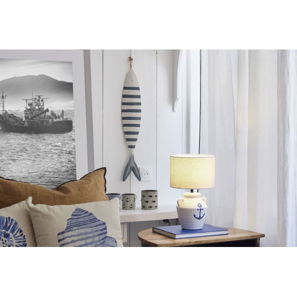 Candeeiro de mesa decorativo em terracota branca, com âncora azul impressa. Inclui cabo preto com switch.