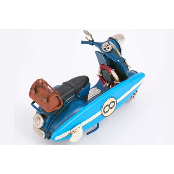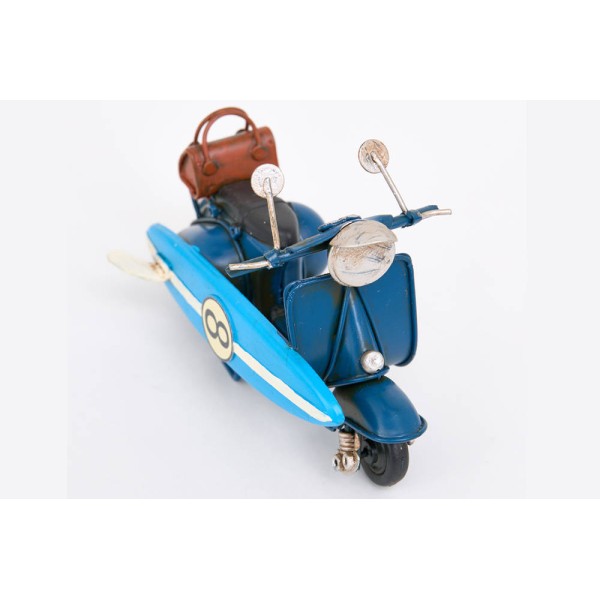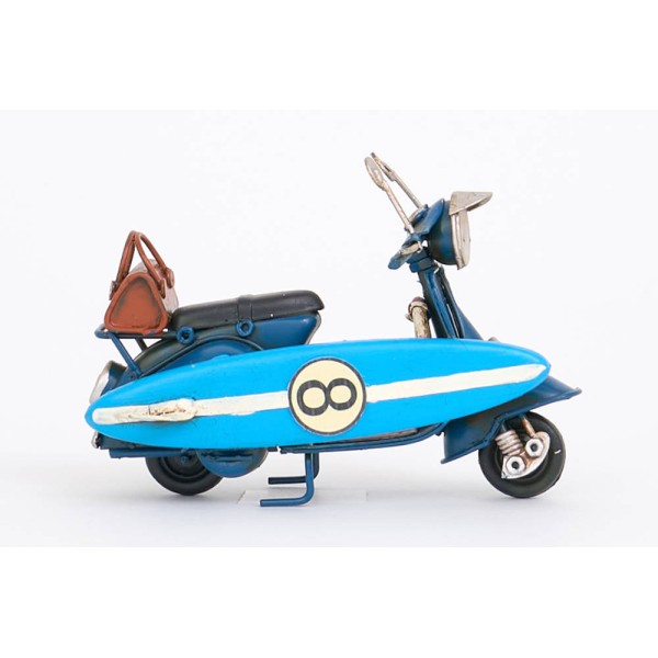 Bonito modelo de uma moto antiga tipo 'Vespa', com prancha de surf, pronta para ir para a praia.