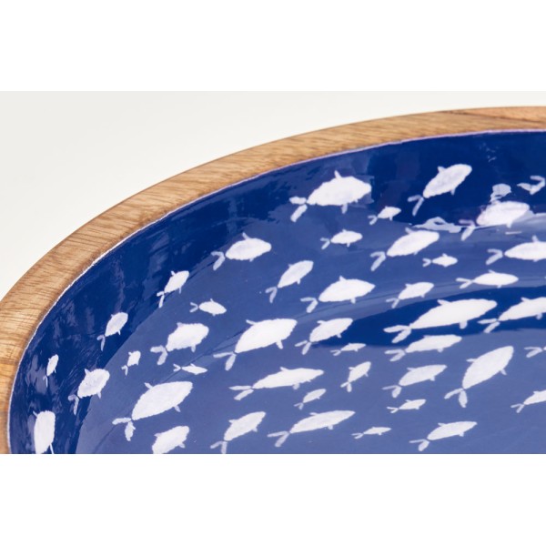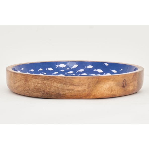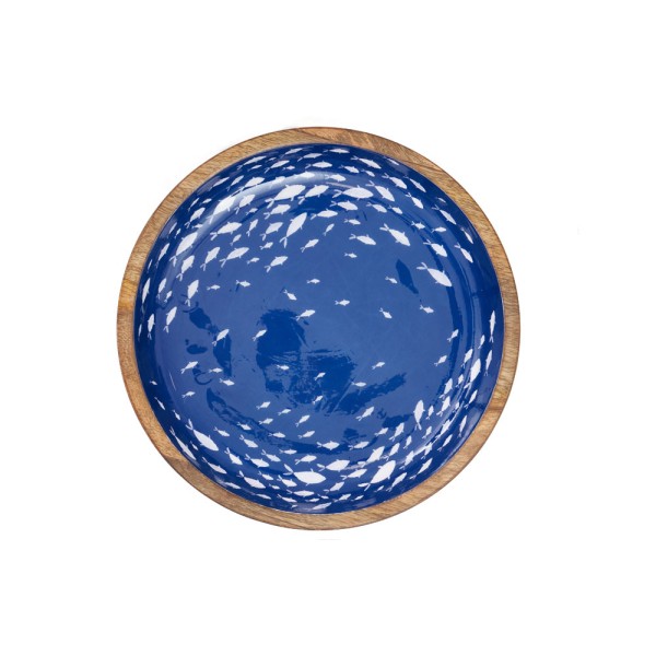 Tigela em madeira de bambu e esmaltada por dentro com peixes impressos.