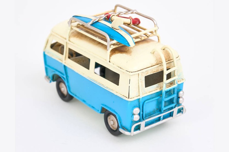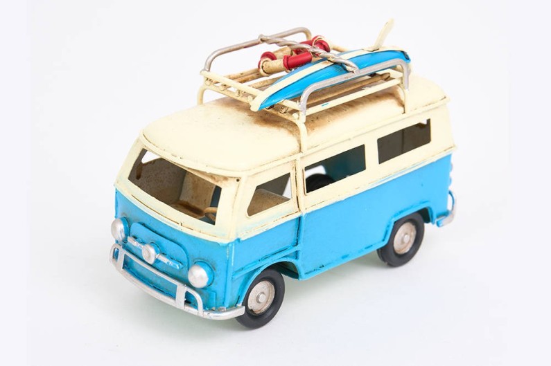 Bonito modelo de uma carrinha antiga dos anos 70, do tipo típico "Volkswagen", com a prancha de surf, pronta para ir à praia.