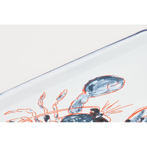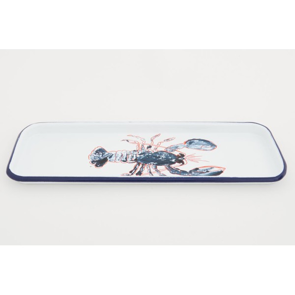 Bandeja em metal esmaltado branco, com lagosta estampada.