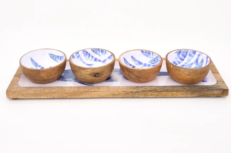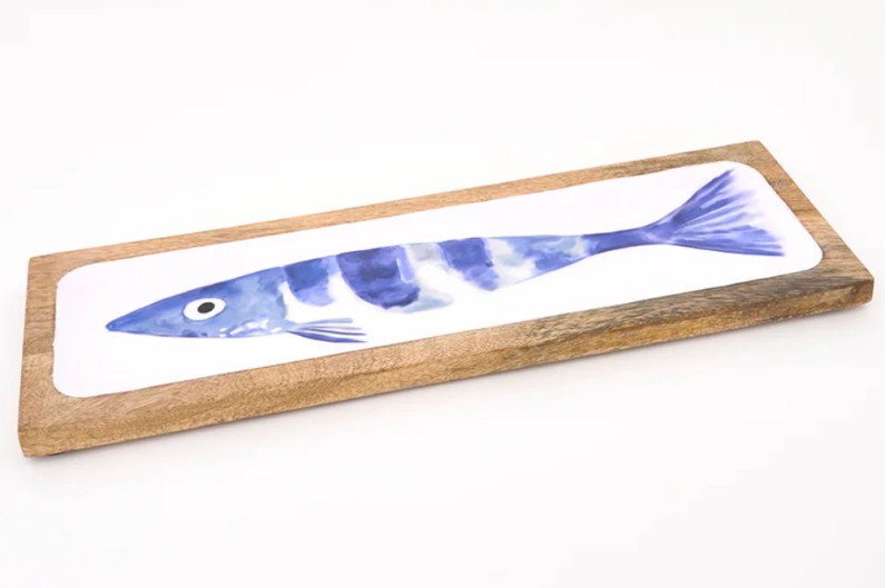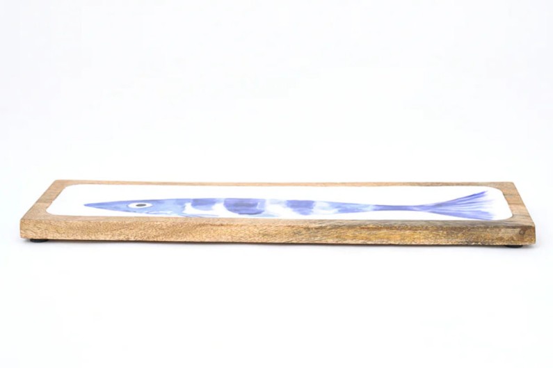 Bandeja de madeira e esmalte com imagem azul impressa.