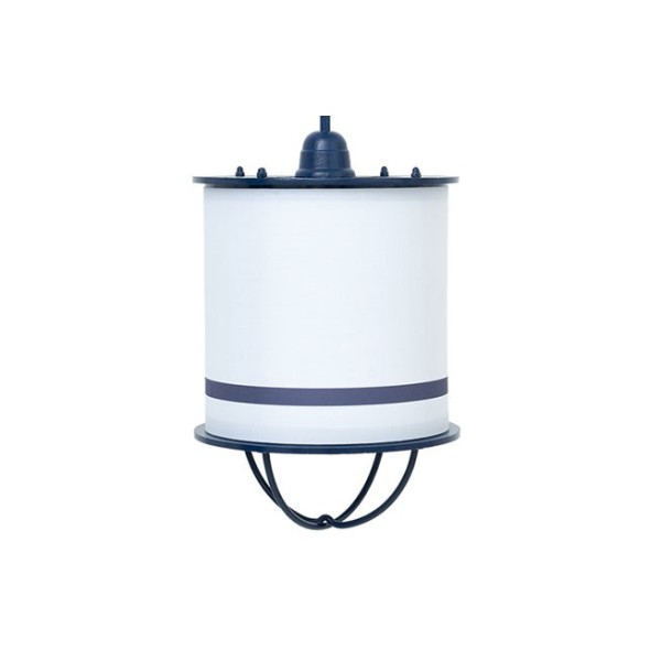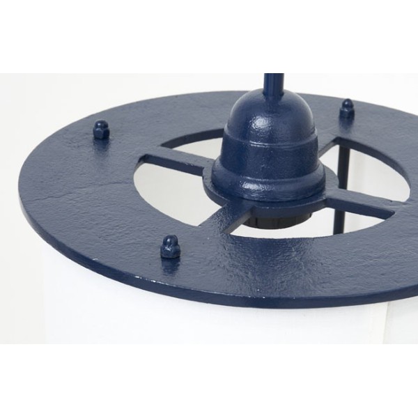 Candeeiro de teto em metal pintado de azul constituído por um abajur translúcido. Funciona com 220v. E27.