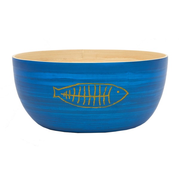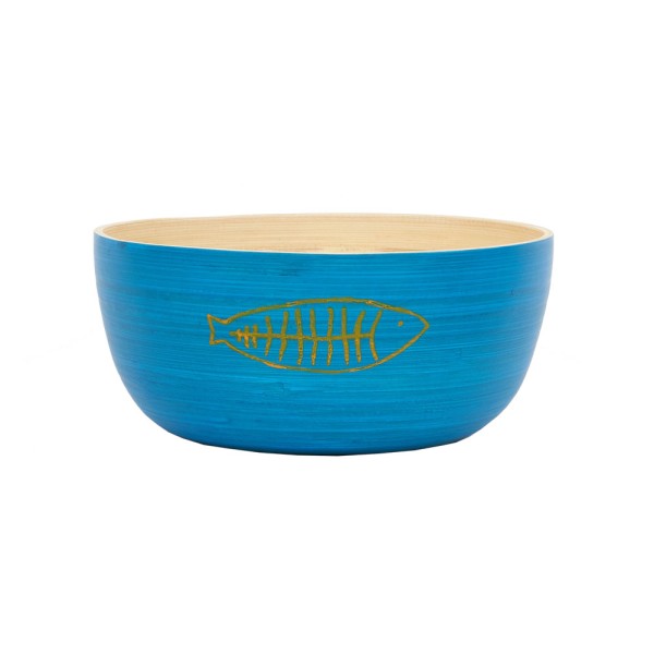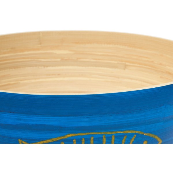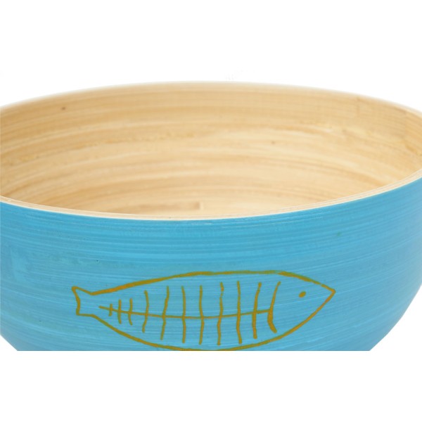 3 tigelas de madeira de bambu, em diferentes cores azuis. Acessórios de mesa de bambu duráveis e ecológicos. Um produto colorido para qualquer ocasião em ambientes internos ou externos.