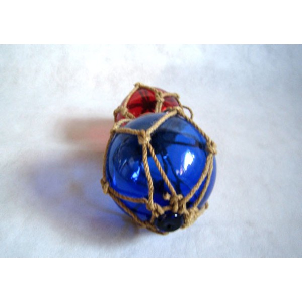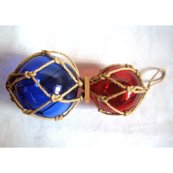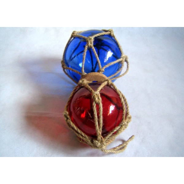 Duas bóias azuis e vermelhas de pesca. A bóia de pesca era um velho carro alegórico que consiste em uma esfera de vidro envolto em uma corda trançada. Foi usado até a década de 50. Tal foi fixado em flutuadores de redes de pesca para que eles permaneçam na superfície como eles andaram a jusante.