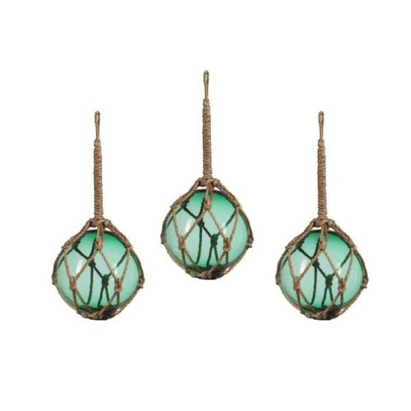 Set de 3 bóias de pesca. A bóia de pesca era um velho carro alegórico que consiste em uma esfera de vidro envolto em uma corda trançada. Foi usado até a década de 50. Tal foi fixado em flutuadores de redes de pesca para que eles permaneçam na superfície como eles andaram a jusante. Um objeto que dão um toque decorativo oceano.
