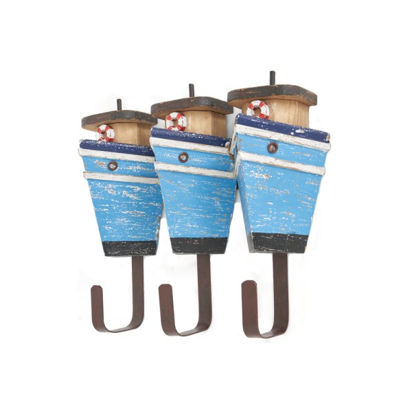 Cabides com barcos de madeira e cabides de ferro fundido.