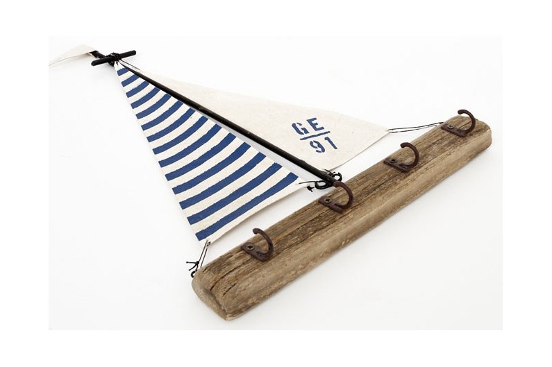 Cabide chaves em forma de veleiro, feito à mão de madeira, aço e com velas de algodão.