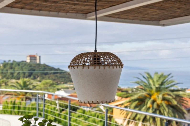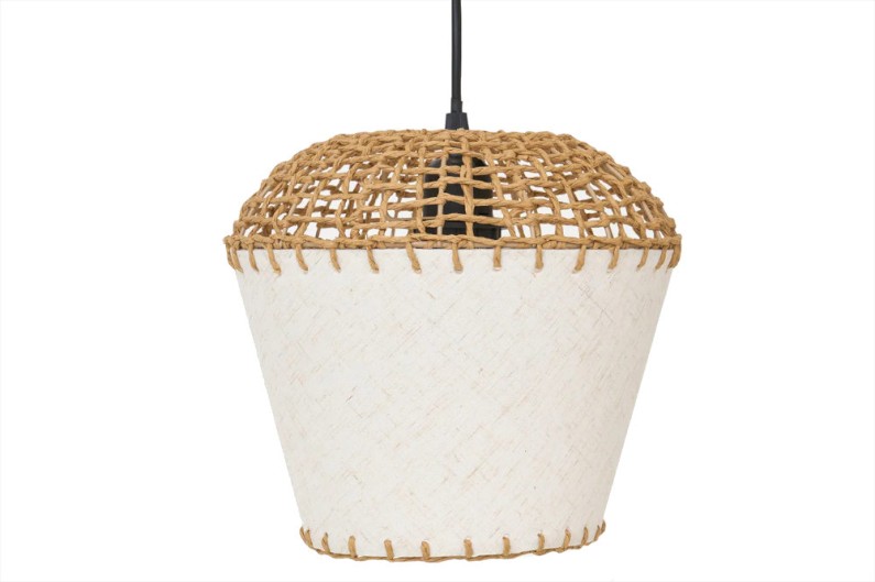 Candeeiro de teto em corda de cânhamo natural com estilo náutico, que emana elegância e leveza. A cúpula é feita de papel reciclado e difunde uma luz suave e agradável.