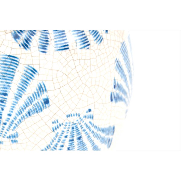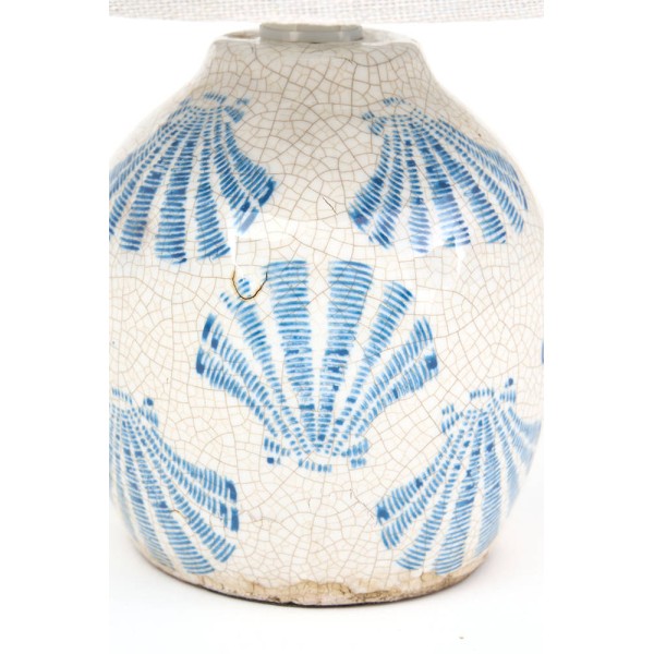 Candeeiro em terracota branca, com conchas azuis estampadas, candeeiro de mesa com cúpula em tecido translúcido.