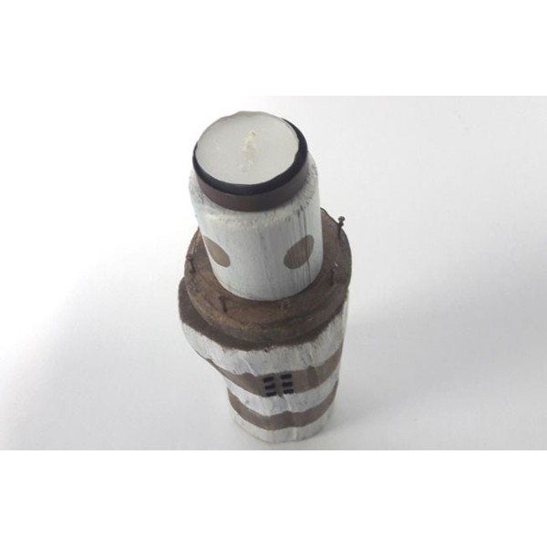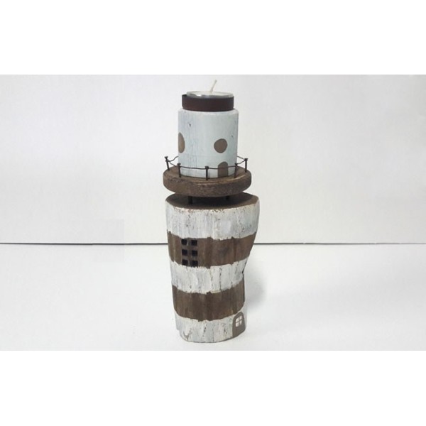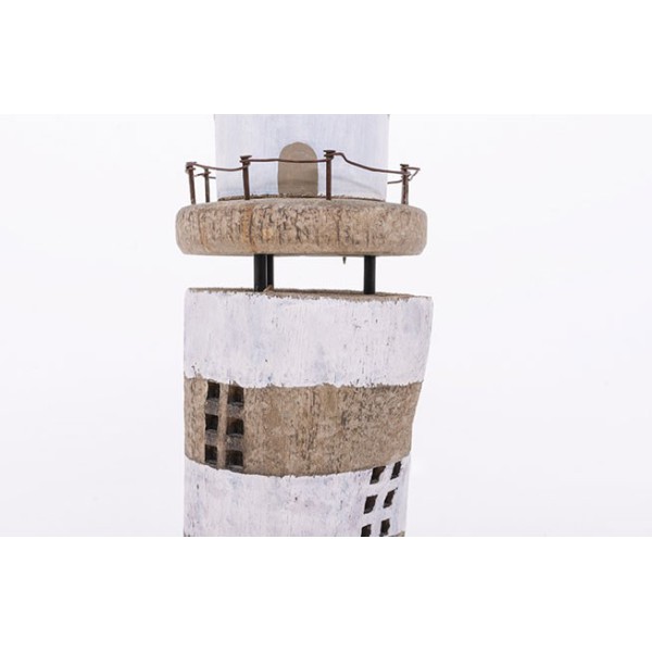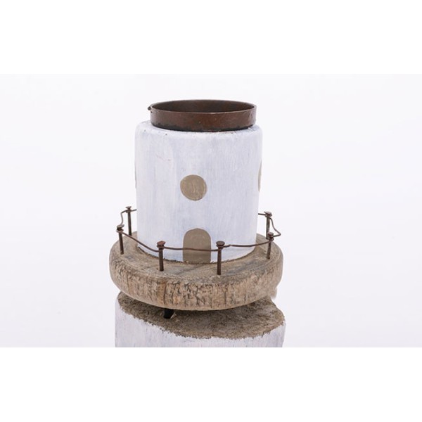 Castiçal de madeira em forma de farol.