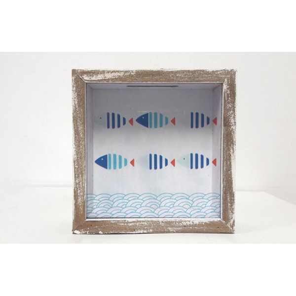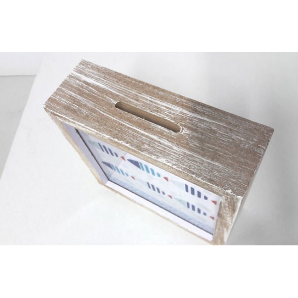 Cofrinho de madeira precioso feito à mão, feito de madeira e vidro, com desenhos de baleias.