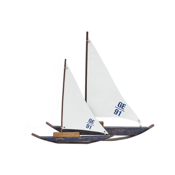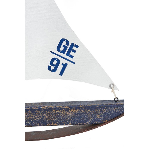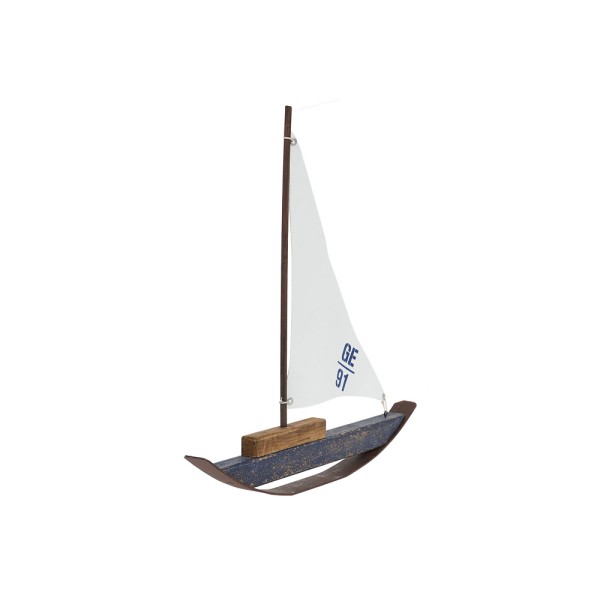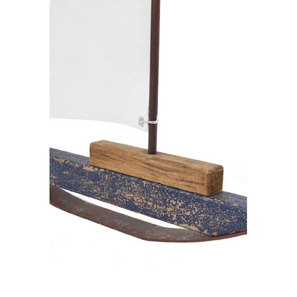Veleiro de mesa decorativo, feito à mão em madeira e aço, design moderno. Ideal para decorações informais e modernas.