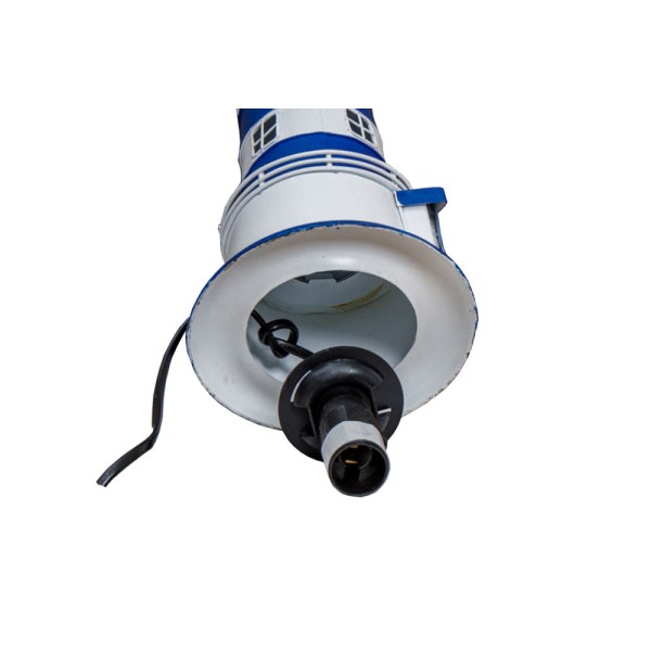 Farol de metal listrado azul com luz. A tomada do farol (E14) está localizada sob o farol. Este farol foi projetado para uso interno e funciona com eletricidade de 220 V. O comprimento do cabo é de 1,5 m e possui interruptor para acender a luz do farol.