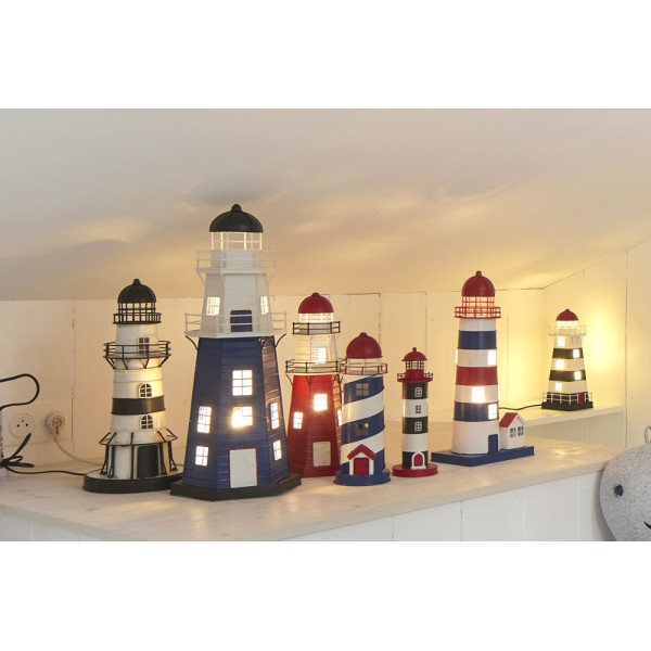 Farol de metal listrado azul e vermelho com luz. A tomada do farol (E14) está localizada sob o farol. Este farol foi projetado para uso interno e funciona com eletricidade de 220 V. O comprimento do cabo é de 1,5 m e possui interruptor para acender a luz do farol.
