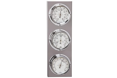 Barômetro. Indica a pressão atmosférica. O instrumento de medição é metálico. Ele é montado em uma base de madeira. Uso preferencial interior.