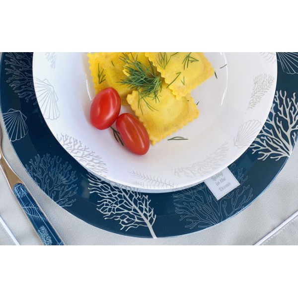 Conjunto de 6 unidades de prato raso de belo desenho, branco e azul.