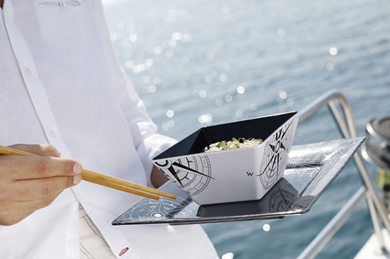 Conjunto de 6 unidades de prato fundo quadrado de belo desenho, branco e preto.