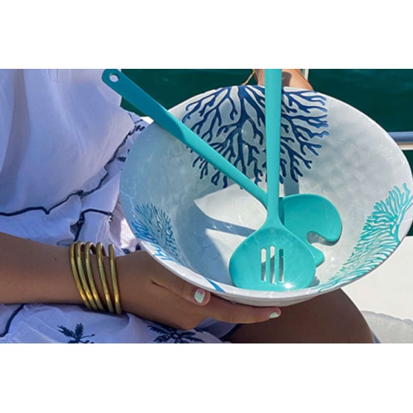 Saladeira com talheres. Fabricado em melamina de alta densidade, adequado para utilização na máquina de lavar louça e resistente a quedas.