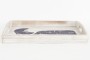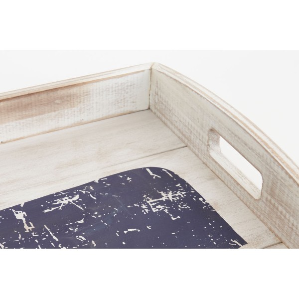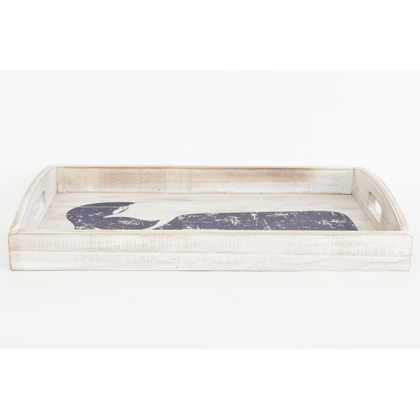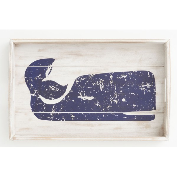 Bandeja de madeira com baleia estampada. Pintado para parecer usado ou antigo, ideal para tomar café da manhã na cama.
