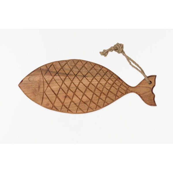 Tábua de corte de cozinha em madeira em forma de peixe.