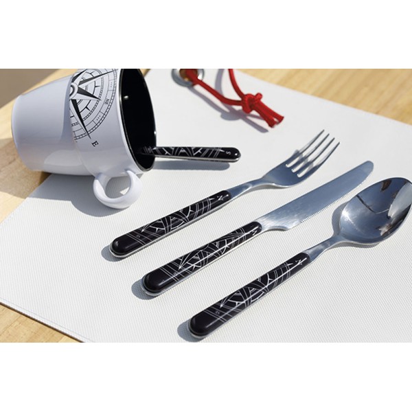Conjunto de 24 peças faca, garfo, colher e colher de sobremesa.