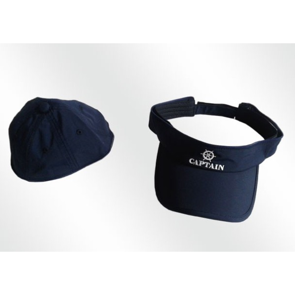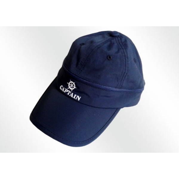 Boné do capitão azul com bordado logotipo do capitão branco. Projetado com aberturas para garantir a aeração da cabeça. Ele também tem uma cremalheira para remover a parte superior da tampa e tornar-se viseira. Traseira ajustável.