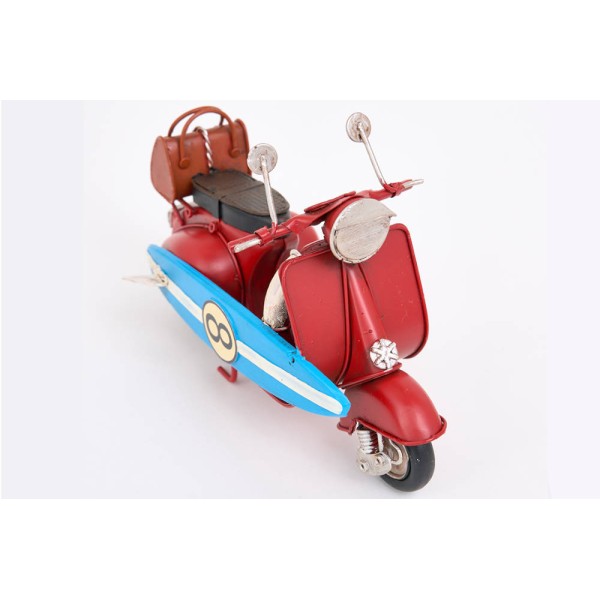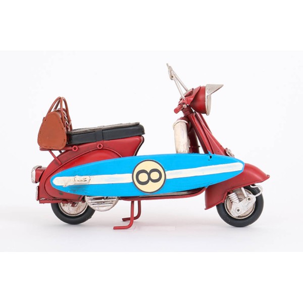 Bonito modelo de uma moto antiga tipo 'Vespa', com prancha de surf, pronta para ir para a praia.