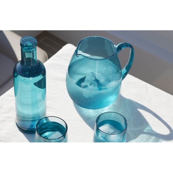 Este jarro de água (2,6L) é feito em ECOZEN, cor turquesa. Além disso, ao usar este produto em áreas externas, evitamos possíveis quebras de vidro por acidente.