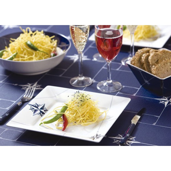 Conjunto de 6 unidades de prato raso quadrado de belo desenho, branco e azul.