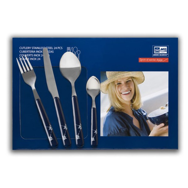 Conjunto de 24 peças faca, garfo, colher e colher de sobremesa.
