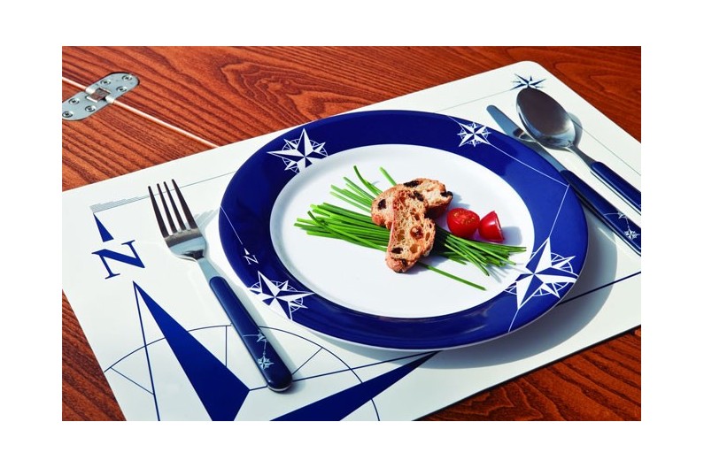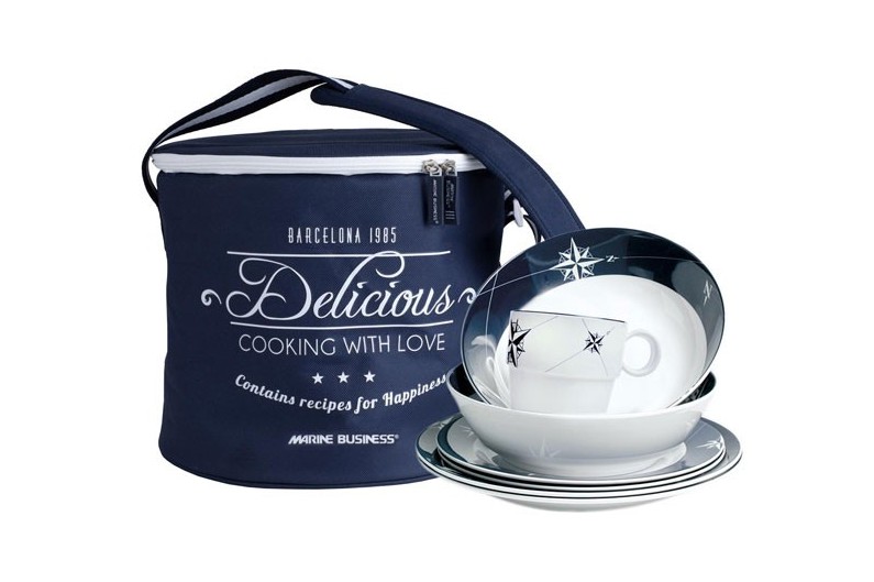 Conjunto de 24 peças, incluindo: 6 pratos rasos, 6 pratos fundo, 6 pratos de sobremesa, 6 taças e saco de transporte.