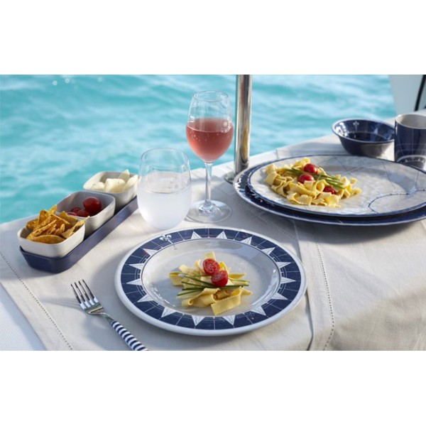 Conjunto de 24 peças, incluindo: 6 pratos rasos, 6 pratos fundo, 6 pratos de sobremesa, 6 taças e saco de transporte.