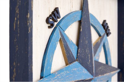 Quadro decorativo de madeira marinho. Uma bonita rosa dos ventos destaca-se na pintura.