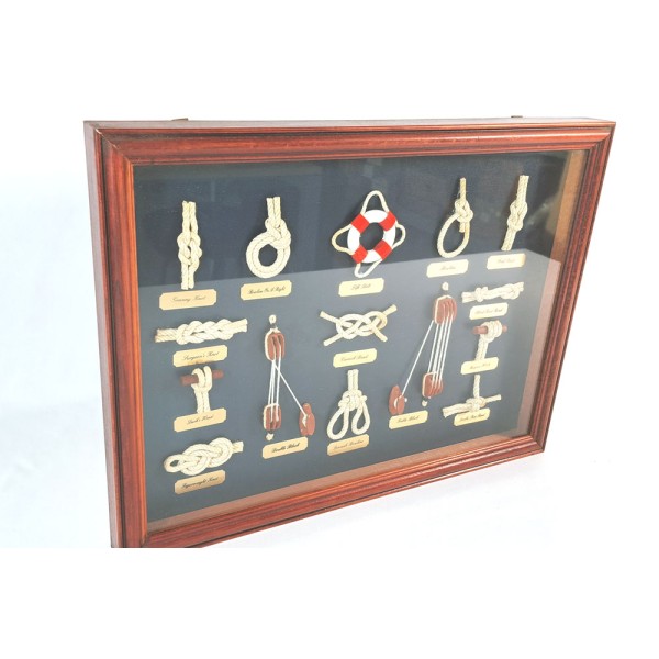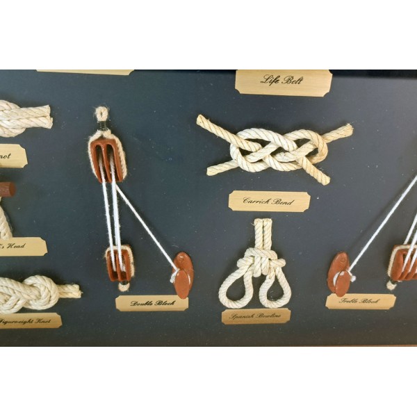 Bonito quadro decorativo de nós marinheiros e cordas, com numerosos artigos náuticos. Com moldura de madeira e protegida com um vidro. A corda usada é de algodão. Cada nó tem uma placa com o seu nome gravado.