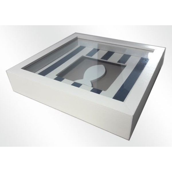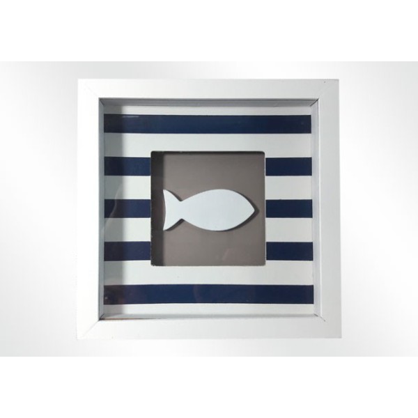 Quadro decorativo de madeira marinho azul. Ergue-se um peixe bom.