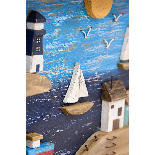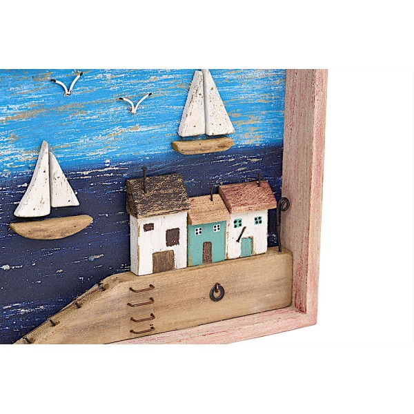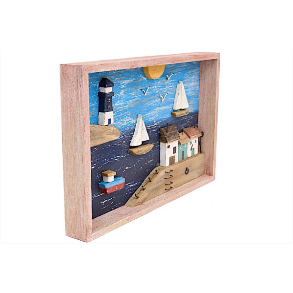 Quadro decorativo de madeira marinho. Apresenta uma bela paisagem marinha.