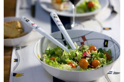 Saladeira com elementos per servem, belo desenho e bandeiras brancas.