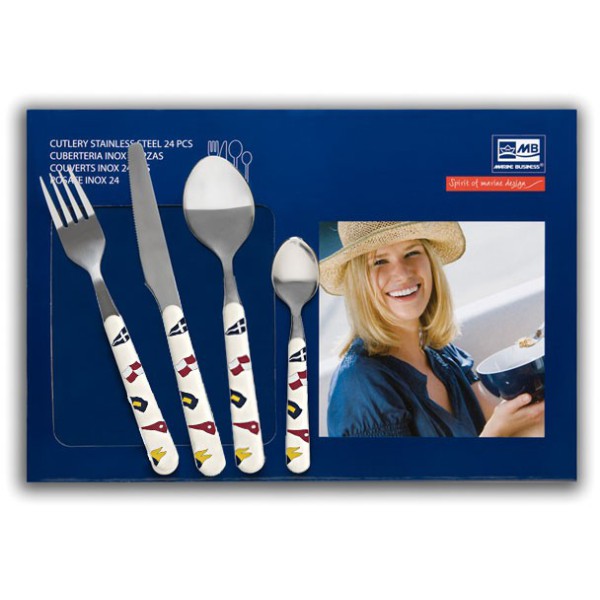 Conjunto de 24 peças faca, garfo, colher e colher de sobremesa.