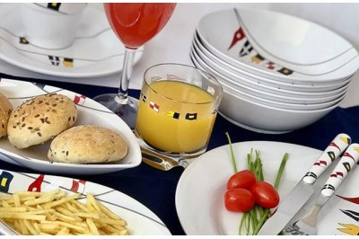 Conjunto de 24 peças, incluindo: 6 pratos rasos, 6 pratos fundo, 6 pratos de sobremesa, 6 taças e saco de transporte.