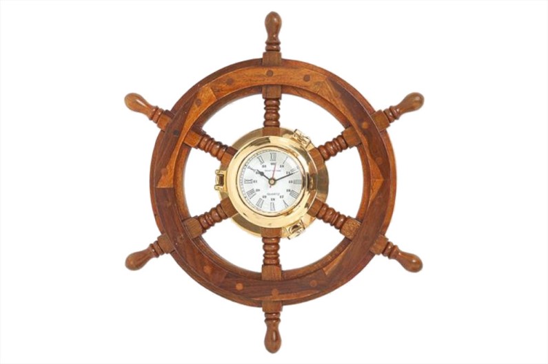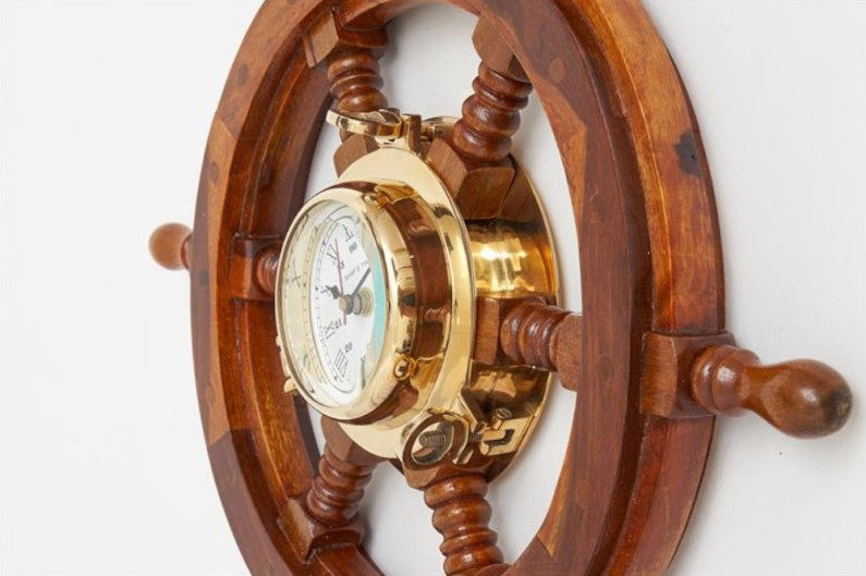 Relógio Bronze acoplado a volante de madeira.