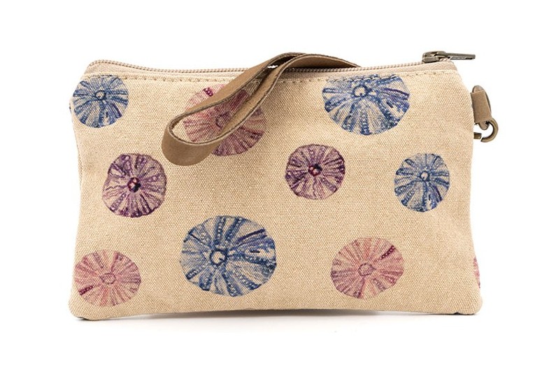 Linda bolsa de algodão, com tiras de couro e estampada com Ouriços do mar.