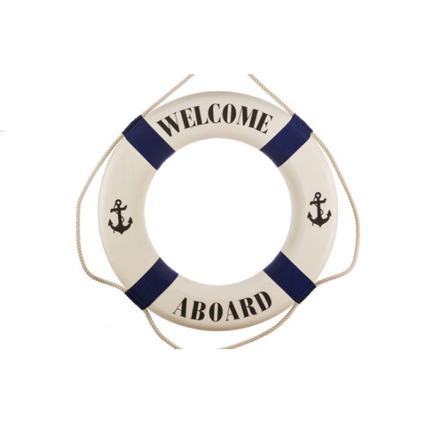 Salva-vidas "Bienvenue a Bord" - "Welcome on board" reversível. Réplica exata de uma vida, ideal para dar um toque à beira-mar para a decoração. Feito em porexpan dentro e coberto com uma lona de algodão. A corda de algodão amarrado em torno dele usado para segurar.