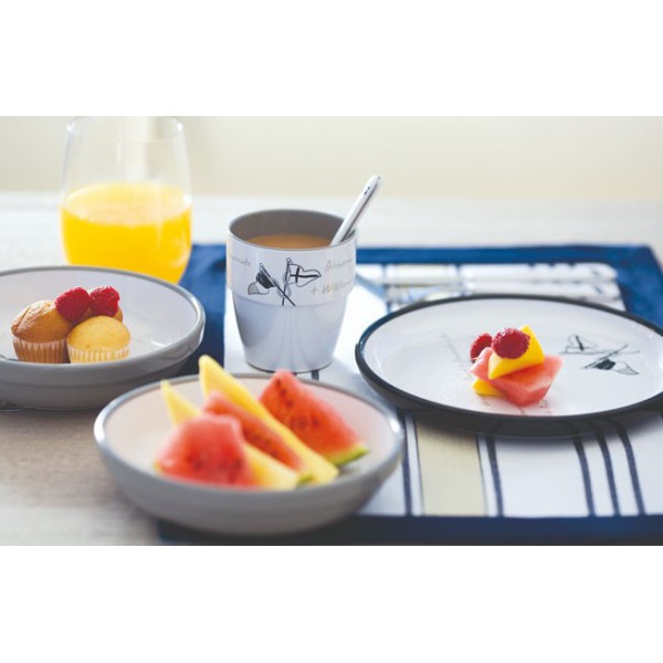 Conjunto de 16 peças, incluindo: 4 pratos rasos, 4 pratos fundo, 4 pratos de sobremesa, 4 taças mais saco de transporte.